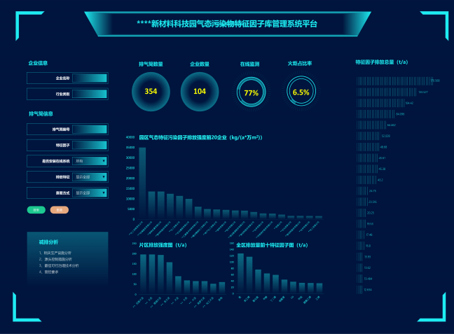為摸清某化工園企業排放的廢氣種類、來源、分布等污染情況,對園區內100多家化工企業共300多個有組織排氣筒的排放情況進行系統化摸排分析及采樣監測,真實地反映廢氣排放的來源裝置、工藝、排放環節、處理設施等關鍵信息,明確各企業有組織廢氣污染物的排放特征,準確、全面地為每個排氣筒排放物質清單和特征因子建檔。通過建立因子庫大數據平臺,實現了排放清單一張表、排放總量一本賬、排放分布一張圖,有效指導大氣網格點監控系統建設、強化大氣監控力度、提高環境監管水平。